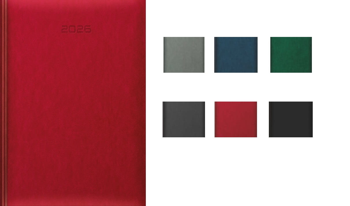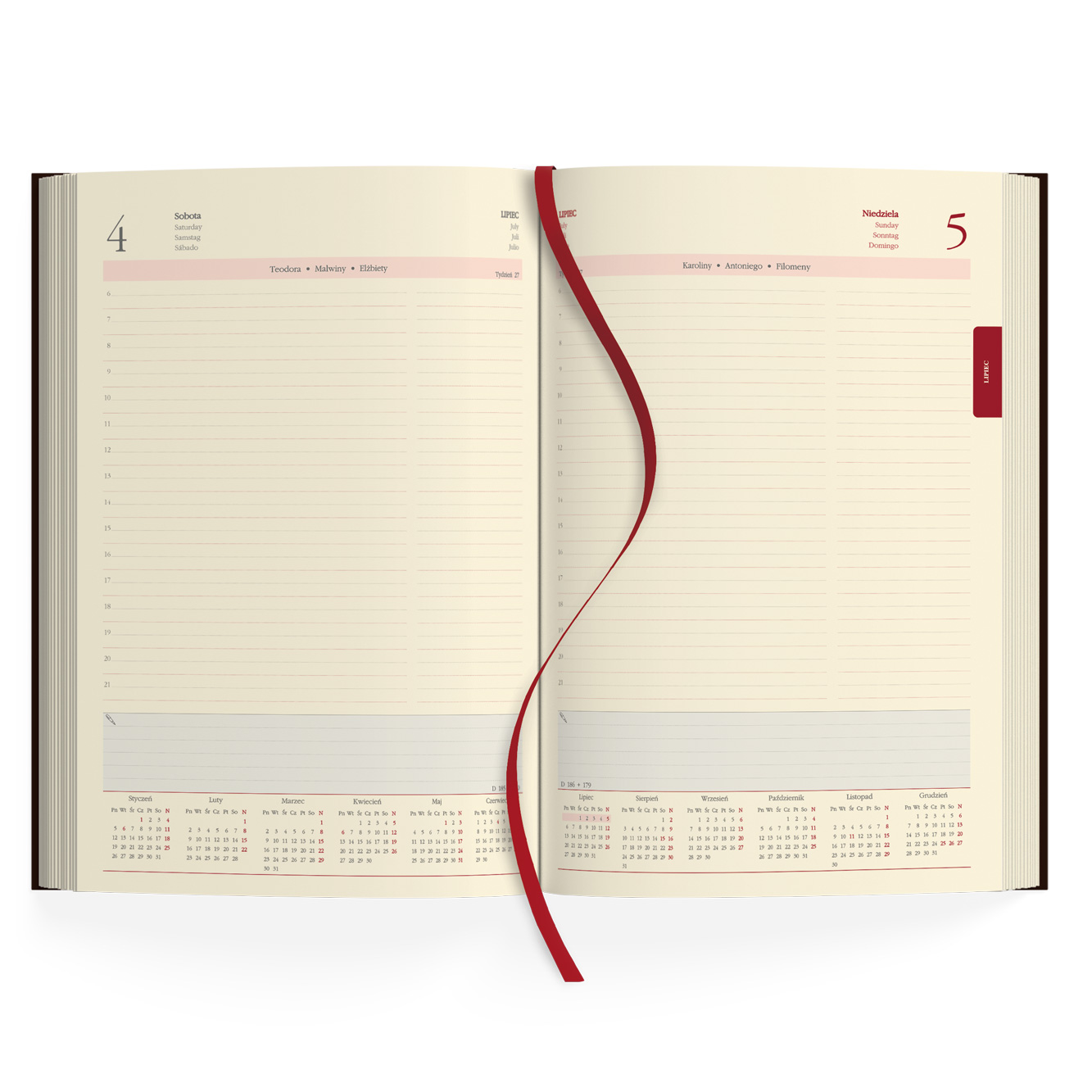 - Układ: 1 dzień na stronie, registry nadrukowane