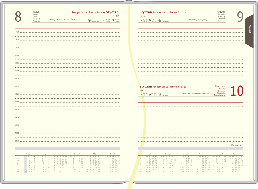 | Układ: | 1 dzień na 1 stronie, sobota i niedziela na 1 stronie, przed każdym miesiącem terminarz miesięczny |