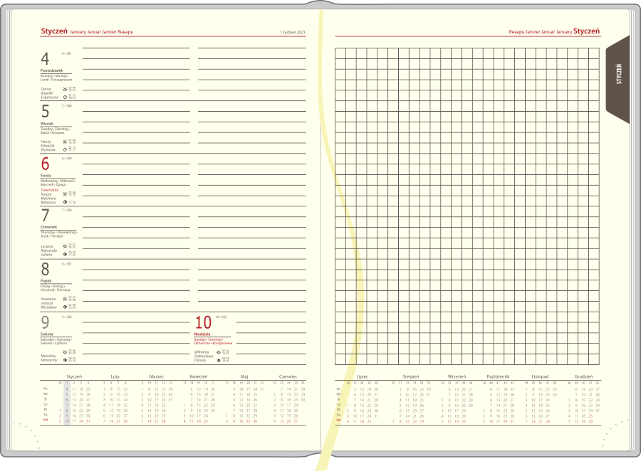| Układ: | tygodniowy, 1 tydzień na 1 stronie na prawej stronie notes w kratkę |